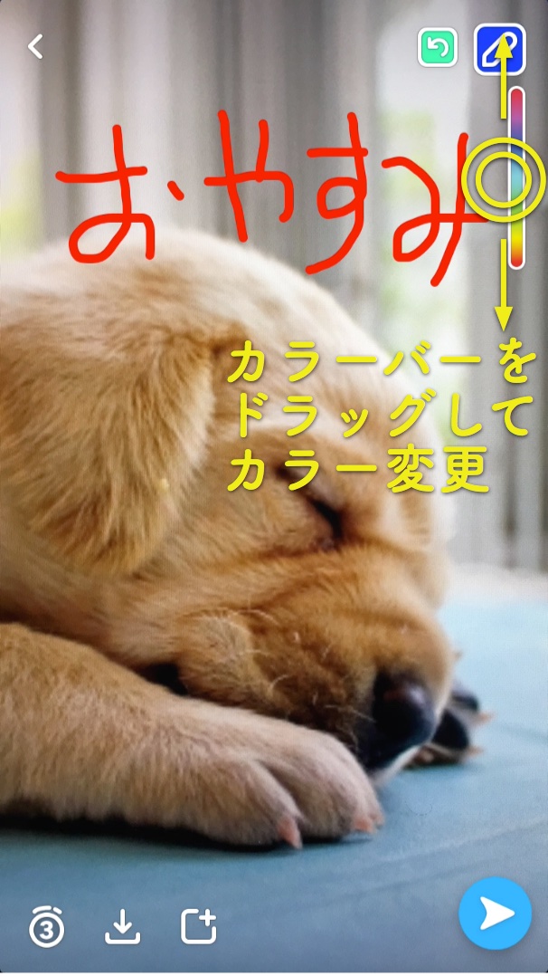 落書き時のカラーは、テロップでテキストカラーを変えた時と同じように、画面右上にあるカラーバーをドラッグして変えられます。