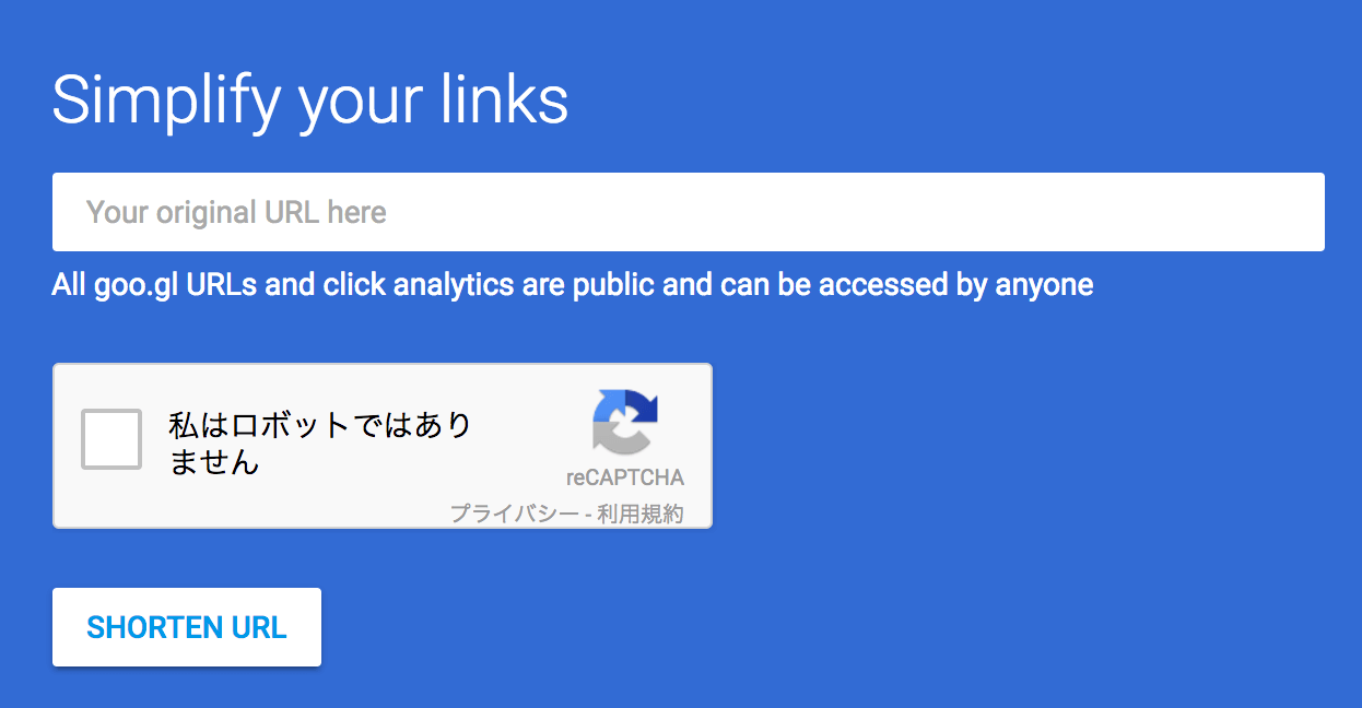 ページにアクセスし、URLをフォームに貼り付けをします。「私はロボットではありません」から認証を行った後に「SHORTEN URL」をクリックしましょう。