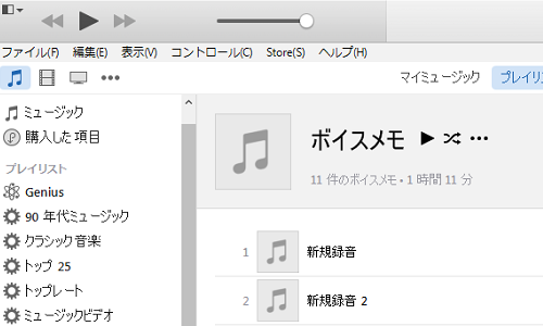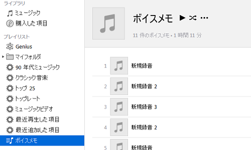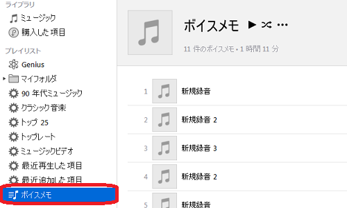 iTunesの左端のメニューで『ボイスメモ』を選択します。 先ほどPCに取り出したボイスメモデータが表示されます。