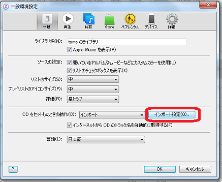 iTunesのメニューからmp3ファイル形式でのインポート設定をします。 まずは『編集』→『設定』をクリック。