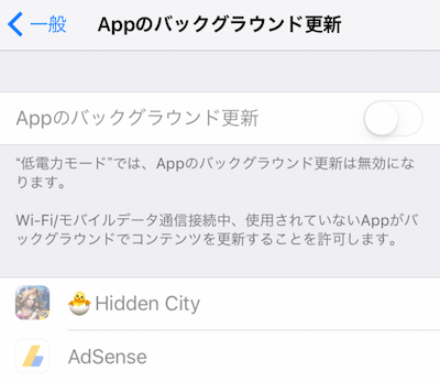 使用されていないAppがバックグラウンドでコンテンツを更新することを許可する設定です。節約するならオフにしましょう。 ・設定アプリを起動 ・一般 ・Appのバックグラウンド更新をオフに