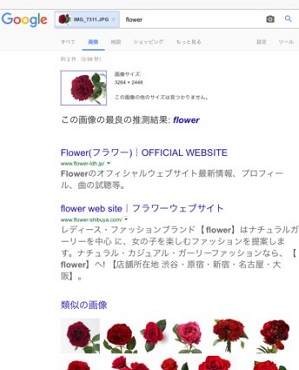 するとこのような検索結果が表示されました。 画像から推測されるワードは「flower」。 「類似の画像」には同じような赤いバラの画像がたくさん表示されています。 拡大しないとちょっと見にくいので、Safariのスマートフォン用の画面でも画像検索出来れば良いなと思うのは贅沢でしょうかね?