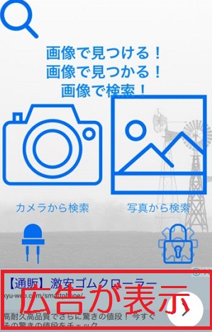 こちらも無料アプリなので広告が表示されましたが、あまり不快な広告ではありませんでした。 検索方法としては ・カメラから検索 ・写真から検索 となっているので、画像から検索することが可能なようです。