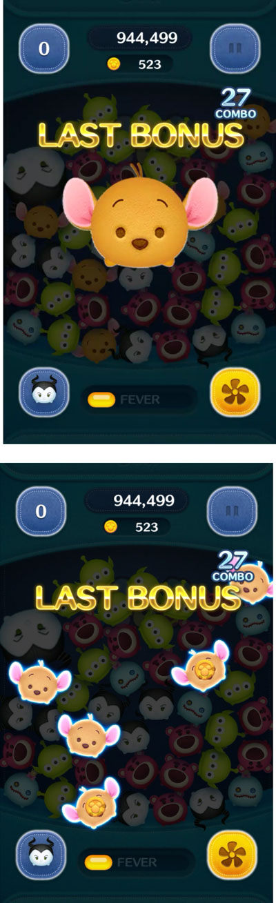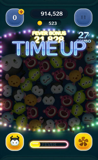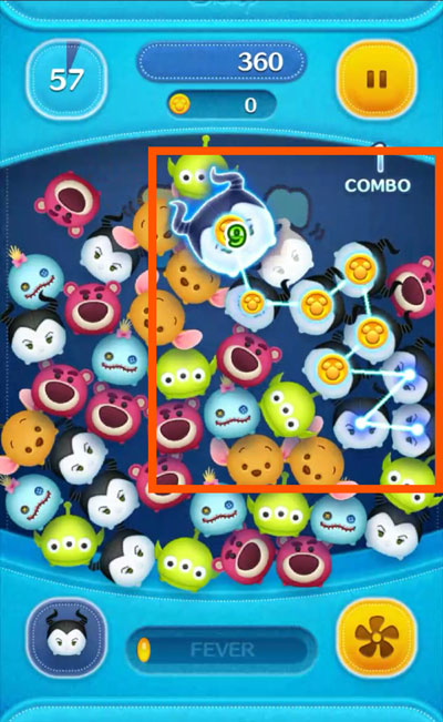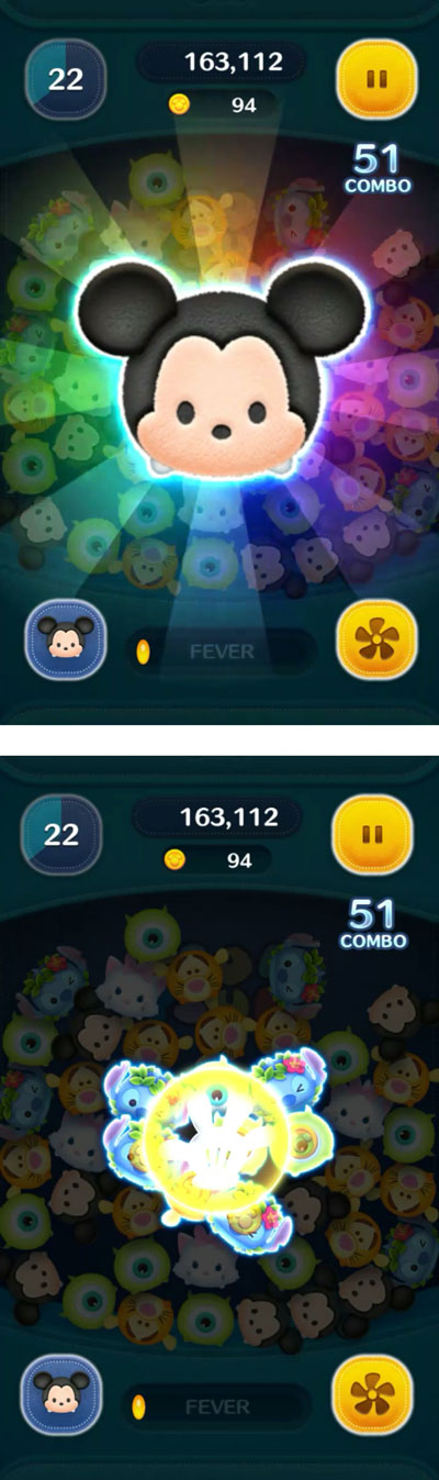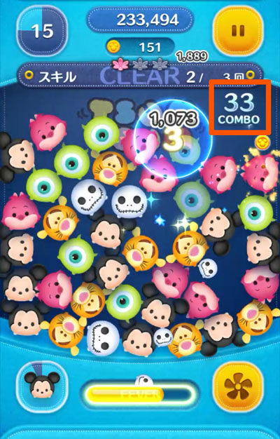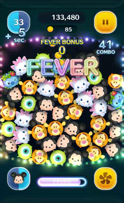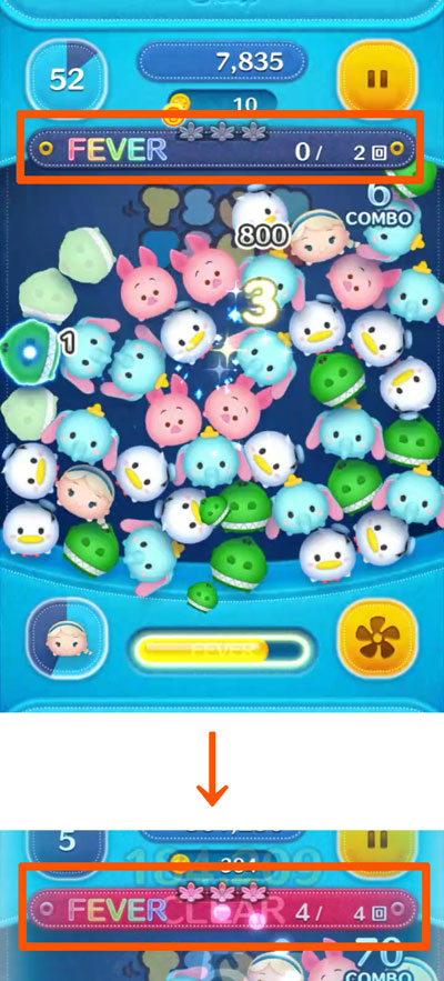 ツムを消していくと、下部分の「フィーバーケージ」が溜まっていき、ツムを30個消すと「フィーバータイム」が発生します。 確認方法は、画面下部分に「フィーバーゲージ」が表示されてあり、全て黄色くなると「フィーバータイム」が発生します。