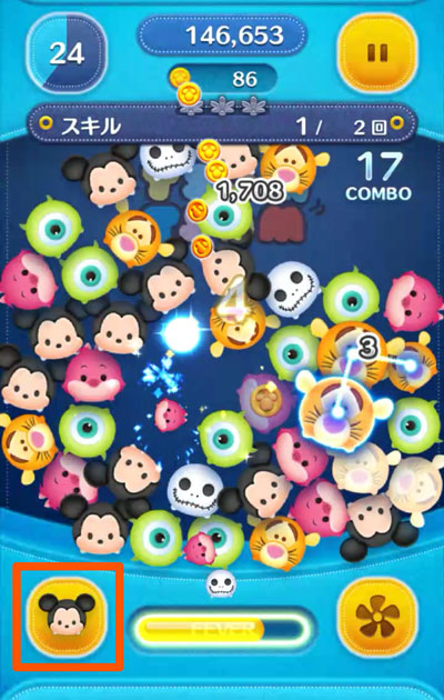 左下部分に表示されているキャラクターのツムが「マイツム」、現在使用しているツムです。 「マイツム」にはそれぞれ「スキル」があります。「スキル」を使うには、左下のマイツムのケージを黄色にします。マイツムのケージは、マイツムのキャラクターツムをつなげて消していく度にマイツムケージがたまっていき、すべてたまってスキルが使えるようになると、マイツムケージ枠がすべて黄色になるとスキルが使えるようになります。 この画像の場合、マイツムはミッキーマウスのツムです。ミッキーマウスのツムをつなげて消して、マイツムのスキル枠を黄色にします。 マイツムのスキル枠を黄色にしたら、「スキル」を使って見ましょう。「スキル」の使い方はかんたんです。黄色になったマイツムの枠をタップするだけ。これで「スキル」が発動します。