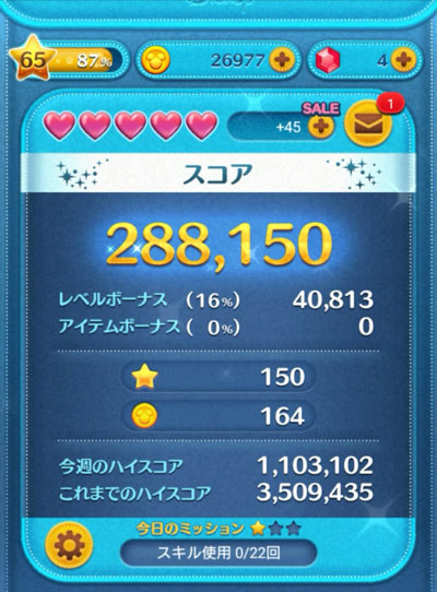 ゲームが終了すると、ゲームの中で「どれだけツムを消したか」が発表されます。ツムを所持している場合、消したツムの数の分だけツムの経験値が上がります。 ツムの経験値が上がり、ツムがレベルアップすると、以前よりスコア点数を多く獲得することができます!