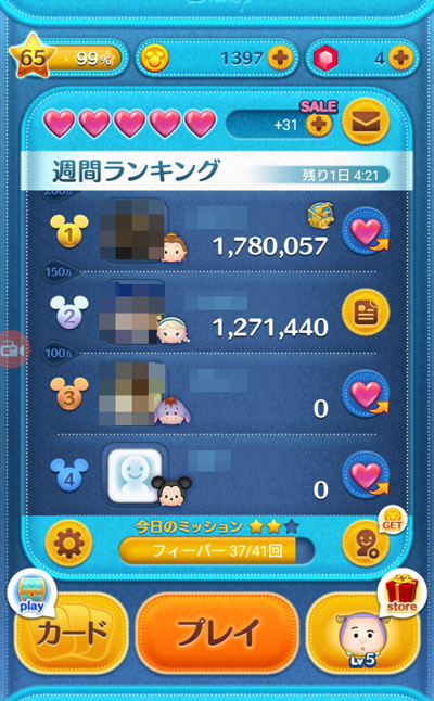 「LINE」に登録している友だちが「LINE:ディズニー ツムツム」アプリをプレイしている場合、友だちの「ハイスコア」が表示されます。 毎週日曜日にリセットされるハイスコアランキングでは、ランキングごとに大量のコインを獲得できます。 友だちより高いハイスコアを取って、コインをゲットしましょう!