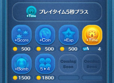 500コインを使って、1プレイのプレイタイムを5秒プラスすることができるアイテムです。