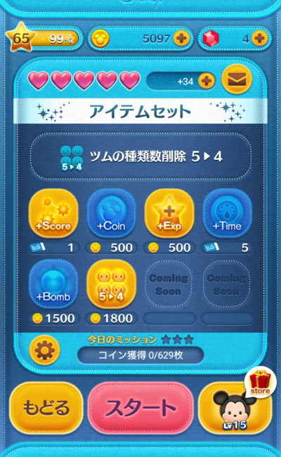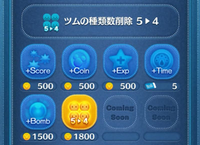 1800コインを使ってこのアイテムを使うと、1プレイ時、通常出現するツムの種類が5つのところ、4つになります。1種類減ると、チェーンがつなぎやすくなります。特におすすめのアイテムです!