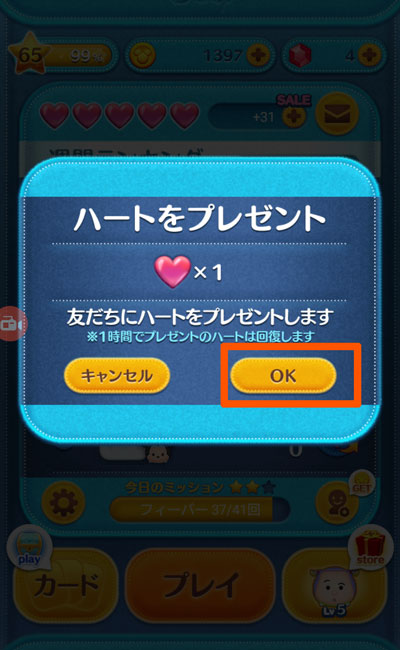 「ハートのアイコン」をタップすると、このような確認画面が表示されます。「OK」をタップすると、選択した友だちに「ハート」が送られます。 「ハート」を送られた友だちが「ハート」を受け取ったり、友だちが「ハート」を送ってくれると、「ハート」が届きます。 友だちに「ハート」を送って、どんどんプレイしていきましょう!