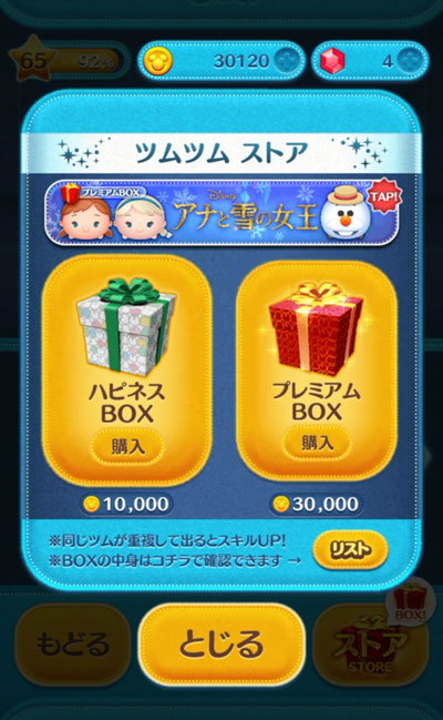 「ストア」ボタンをタップすると、「ハピネスBOX」と「プレミアムBOX」の購入選択画面が表示されます。 「ハピネスBOX」は10,000コインで購入、「プレミアムBOX」は30,000コインで購入できます。 「ハピネスBOX」は少ないコインで購入できますが、入手できるツムの種類が「ミッキーフレンズ」のみと限定されています。 「プレミアムBOX」は多くのコインが必要になりますが、限定配信のツムや特別なツムなどを入手することができます。限定配信のツムなどが入手できる「プレミアムBOX」の購入をおすすめします!