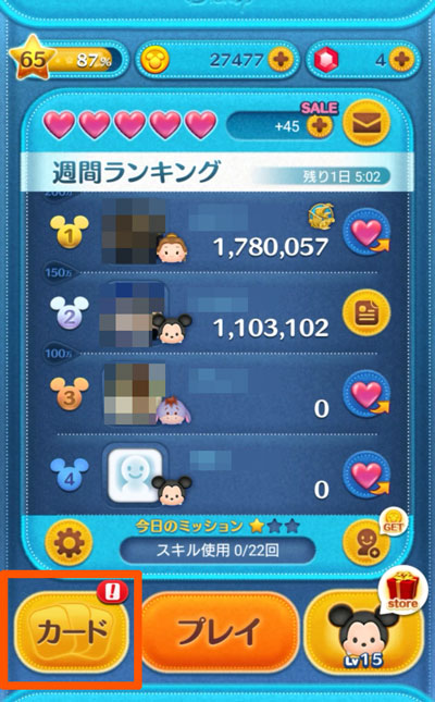 「LINE:ディズニー ツムツム」アプリには、「ビンゴカード」があります。ビンゴカードを埋めると、通常コインで購入するはずの便利なアイテムやツムのスキルの効力を上げるスキルチケット、「プレミアムBOX」を購入できるチケットなどを獲得できます。 アイテムを獲得するには、「ビンゴカード」を始めなくてはいけません。ランキング画面の左下「カード」ボタンをタップします。