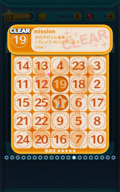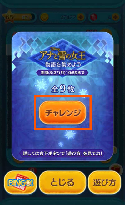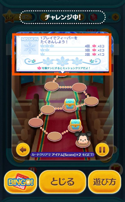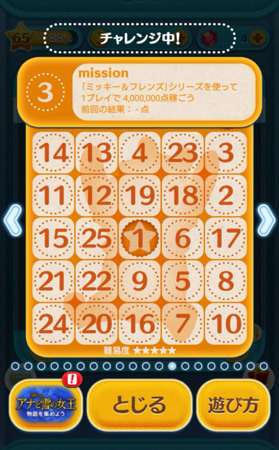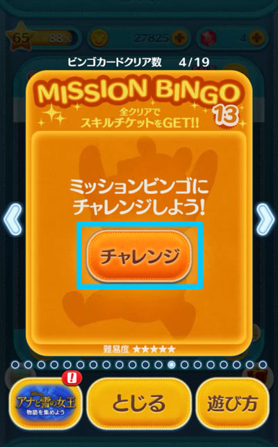 「チャレンジ」ボタンをタップすると、真ん中の「1番」が埋まります。 ビンゴカードのそれぞれの番号をタップすると、クリア条件が表示されます。 クリア条件を確認したら、「とじる」ボタンをタップしてランキング画面に戻ります。 ゲームをプレイして条件をクリアしていきましょう!