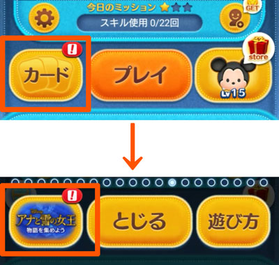 「LINE:ディズニー ツムツム」アプリでは、限定のピンズや限定のツムが手に入る「イベント」が不定期に開催されています。 「イベント」が開催されているかどうか確認するには、ランキング画面左下部分の「カード」のボタンを見ます。「カード」のボタンの上に「!」のマークが付いていると「イベント」が開催されています。 開催されている「イベント」を始めるにはランキング画面の左下部分の「カード」をタップ、左下部分の「イベント名が書かれたボタン」をタップします。