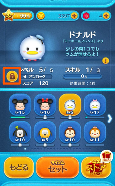 ツムは経験値を獲得するとレベルアップします。ツムのレベルの上限は30で、レベル5単位ごとに「アンロック」され、「アンロック」を解除するとレベルの上限が開放されます。 レベルの上限が開放されたツムでプレイするとより多くのスコア点数を獲得することができます。 レベルの「アンロック」には必要な数のコインが必要です。 コインを集めたら、ツムのレベルを開放してみましょう! ツムのレベルを開放するには、レベルを開放したいツムを選択して、上部左辺りにあるアンロックの文字の左、「鍵のマーク」のアイコンをタップします。