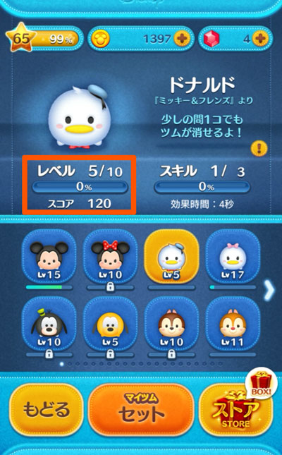 レベルが5のドナルドツムをレベル解放して、レベルが10になりました! これで、このツムを使ってプレイするとより多くのスコアを獲得することができますね。