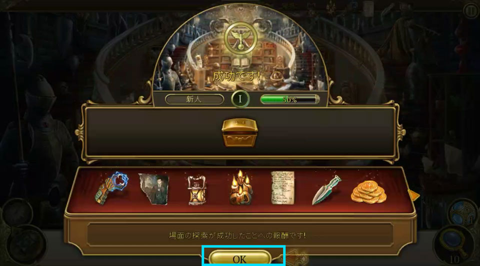 すべてのアイテムを発見し、ケージ内がすべて緑色になると、ステージクリアです。 クリアすると、そのステージで発見した「アーティファクト」と、コインなど、報酬が手に入ります! 確認しましたら「OK」ボタンをタップしましょう。