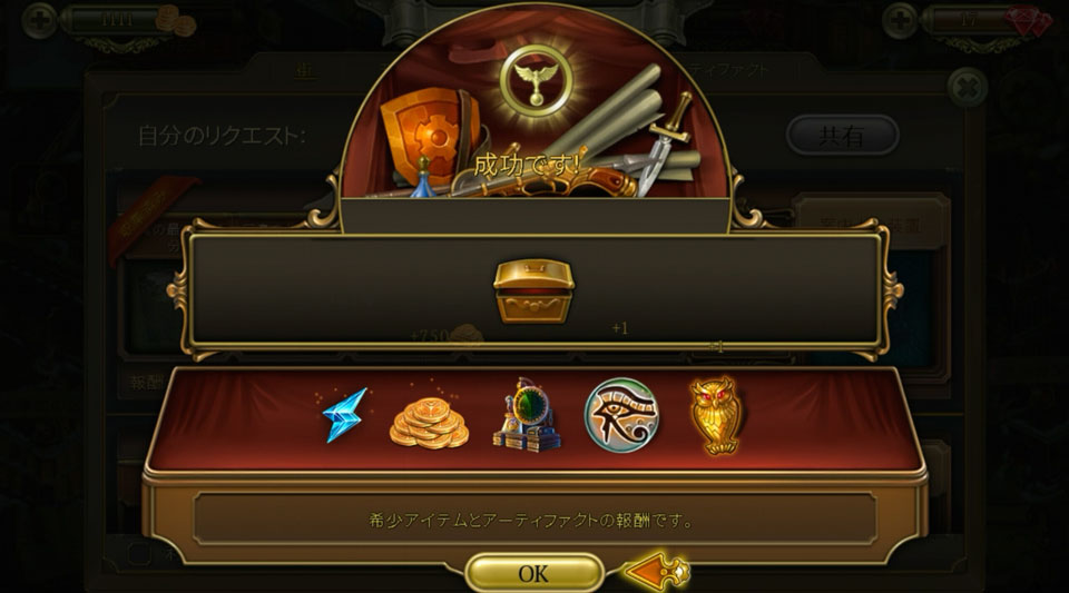 「集める」ボタンをタップすると、特別なアイテムが作成され、コインや希少アイテムなどの報酬があります。 捜索をして「アーティファクト」を集めて特別なアイテムを作成していきましょう。