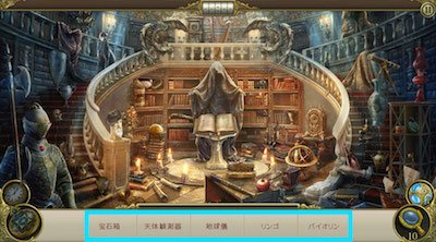 また、探すアイテムも「地球儀」「りんご」「バイオリン」など、さまざまにバリエーションがあり、アイテム探しをすることがとても楽しくなります。