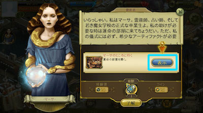 左端の「女性のアイコン」をタップすると、アイコンの女性“マーサ”と会話することができました。 画面の表示通り、“マーサ”のところへ行きましょう。 「→」が表示されている「表示」ボタンをタップします。