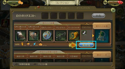 「コレクション」をタップすると、コレクション画面が表示されます。 指定されている「アーティファクト」を集めると、特別なアイテムを作成できます。 指定されている「アーティファクト」を集めたら、「集める」ボタンをタップして、アイテムを作成しましょう。