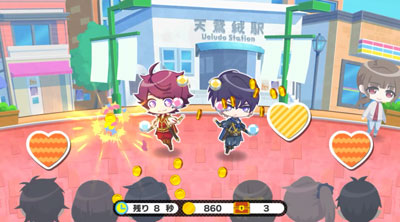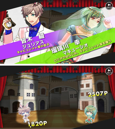 公演中は豪華声優陣によるイメージソングが流れ、劇団員キャラクターたちがポイントを獲得していきます。 公演中はこちちらもキュートなちびキャラの劇団員キャラクターたちがお芝居を演じていきます。とても可愛くて癒やされますね!