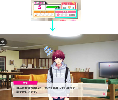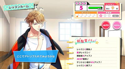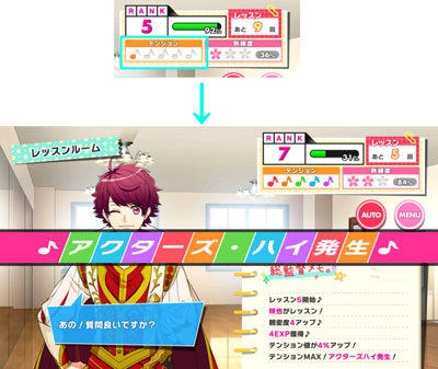 画面右上、「テンションケージ」の音符のアイコン5つすべてに色が付くと「アクターズ・ハイ」が発生します。 「アクターズ・ハイ」発生中は、通常時よりも多くの経験値や親密度が獲得できます!「アクターズ・ハイ」の発生条件は「稽古ミッション」に書かれています。 経験値や親密度をたくさん獲得できる「アクターズ・ハイ」を発生させて、攻略に役立てていきましょう!