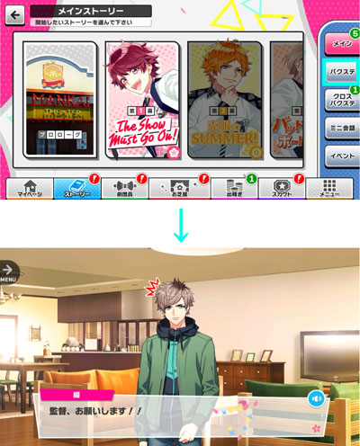 『A3!(エースリー)』の1番の魅力は、何と言っても豪華声優陣によるフルボイスで見れる「メインストーリー」です。キャラクターを演じる声優陣は、どの声優さんも上手な方ばかりで、キャラクターが話す度に生き生きと、輝いていきます。また、登場するキャラクターたちもただのイケメンではありません!少し過去に何かを抱えていたり、ダメな欠点を抱えていたり。と、とても個性が豊かで、魅力的なキャラクターばかりです。 そんなキャラクターたちと「監督」の掛け合いが見れる「メインストーリー」に思わず夢中になってしまい、読む度にストーリーやキャラクターに引き込まれていきます。 「メインストーリー」を読むために、「稽古」や「公演」などを攻略していきましょう!
