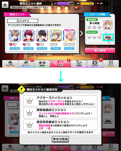 「稽古」には「稽古ミッション」があり、「稽古ミッション」を達成すると、それぞれ報酬を獲得することができます。 「稽古ミッション」で獲得できる報酬は、「稽古」でしか見ることのできない特別な会話だったり、新しいキャラクターを「スカウト」したり体力を回復したりできる「ダイヤ」など。とても重要な報酬ばかりです。 「稽古ミッション」は「稽古」するステージを選択後、「稽古」ステージ画面の右側「ステージ情報」の「詳細」から確認できます。 さらに、「稽古ミッション」をすべてクリアするとダイヤが3つ獲得できます。「稽古ミッション」を確認して、「稽古ステージ」をそれぞれ攻略していきましょう!