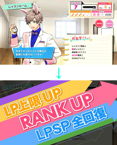 「RANKアップ」すると、「LP」の上限が上がり、「LP」と「SP」が全回復します。また、「RANKアップ」すると新しいメインストーリーが解禁されます。 新しいメインストーリーを見れるように「稽古」を攻略して、「RANKアップ」を目指しましょう!