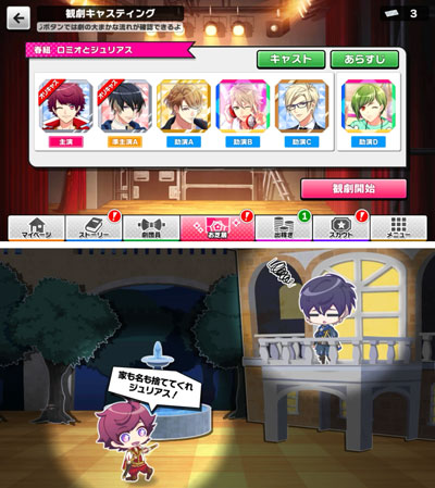 「観劇準備」では、メインストーリーでの劇の題材を、好きに配置したキャラクターたちで「劇」を見ることができます。 メインストーリーとは違った配置でみる「劇」は、なんだかとても新鮮!それぞれのキャラクターたちの個性が光る言動は、キュートなちびキャラによって再現されます。とってもかわいいキュートなちびキャラのキャラクターたちは、見ているだけでもとっても癒やされます! 「観劇準備」に必要な「プレミアムチケット」は、「稽古」中にランダムで獲得できます。「プレミアムチケット」を獲得するためにも「稽古」を攻略していきましょう!
