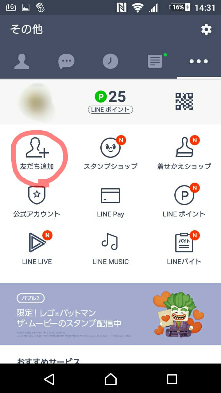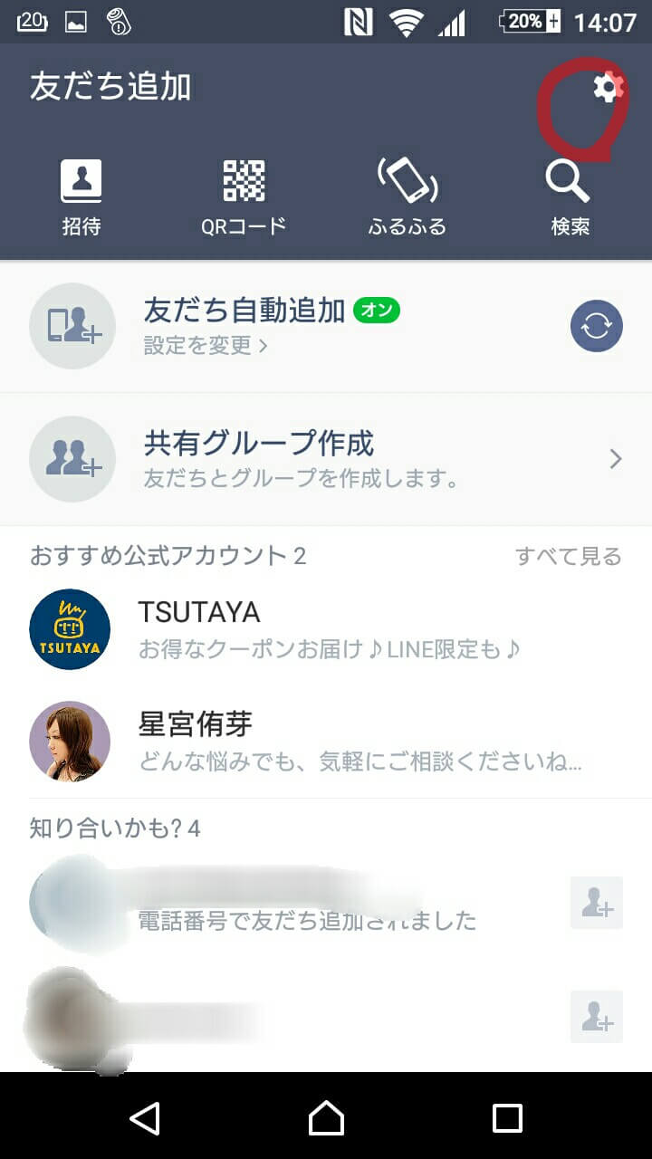「友だち追加」を開いたら画像の右上の歯車マークを押します。