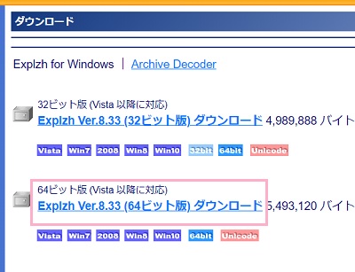 下記リンク先の「Explzh for Windows」ダウンロードページにアクセスしたら、自分の使用しているWindowsのビット数と同じダウンロードリンクをクリックしてインストーラーをダウンロードしましょう。