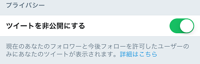 「ツイートを非公開にする」の〇を左にスライドします。 すると、背景が緑色になり、ツイートが非公開の状態になりました。