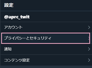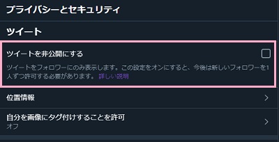プライバシーの画面を見ると、セキュリティ関連のリストが並んでいます。 上部にツイートを非公開にするがあります。