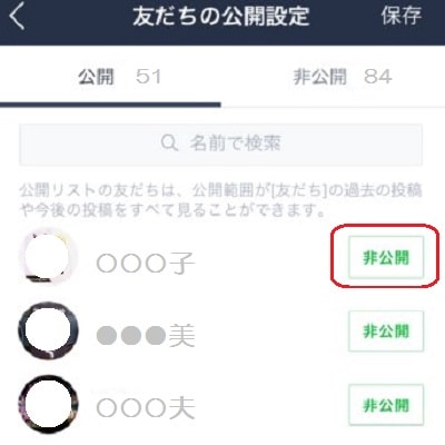 タイムラインを見せたくない友だちの名前右側の「非公開」をタップします。 すると「非公開」にした友だちが、こちらのタイムラインを見ても投稿が表示されなくなります。
