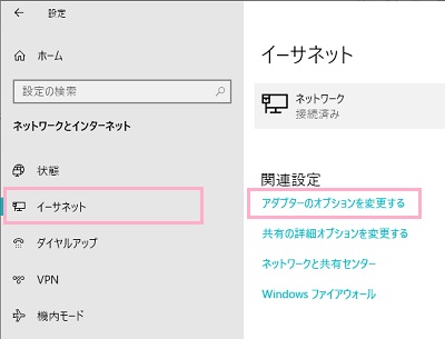 設定画面が開くので、左側メニューの「イーサネット」をクリックします。イーサネットの項目一覧から「アダプターのオプションを変更する」をクリックしましょう。
