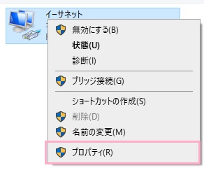ネットワークアダプターの一覧が表示されるので、使用中のネットワークアダプターを右クリックしてメニューの「プロパティ」をクリックしましょう。