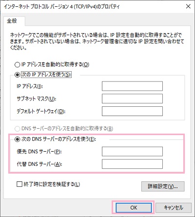 「インターネット プロトコル バージョン 4(TCP/IPv4)のプロパティ」が表示されるので、「次のDNSサーバーのアドレスを使う」を選択した状態で「優先DNSサーバー」と「代替DNSサーバー」にDNSサーバーのアドレスを入力して「OK」をクリックして設定を完了しましょう。これでDNSサーバーを切り替えることができますよ。どのDNSサーバーを使えばいいのか分からない場合は、下記リンク先の記事にておすすめのパブリックDNSサーバーをご紹介しています。併せてご覧ください。