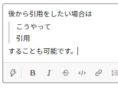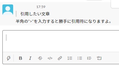 ただEnterを押して改行するとそのまま引用符が付いてしまい複数行の引用状態になるので、改行したら一度BackSpaceキーを押しましょう。これで引用符を解除して通常のメッセージが入力できます。