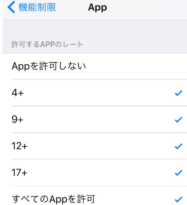 パスコードを入力した後は、機能制限の下部にある「App」をタップしましょう。すると、画像のような画面に行くので、「すべてのAppを許可」にタップし、チェックマークが付いている事を確認して下さい。 ここまで出来れば、Twitterに限らず年齢制限は解除されています。