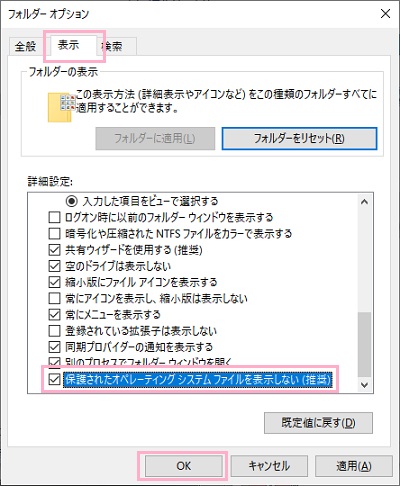 ごみ箱の修復が完了したら、操作ミスを起こさないようにフォルダーオプションを開いて「保護されたオペレーティングシステムファイルを表示しない(推奨)」のチェックボックスをオフにして設定を完了しましょう。