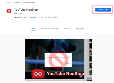 YouTube NonStopのインストールが完了すれば、「自動再生は一時停止されています」・「続きを視聴しますか?」といったメッセージが勝手に表示されて動画が止まることはなくなりますよ。