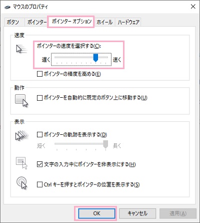 マウスカーソルの動きが悪いという場合は、感度ではなくマウスカーソルの速度が遅いだけのケースかもしれません。「マウスのプロパティ」を開いて、マウスカーソルの速度を調整してみましょう。