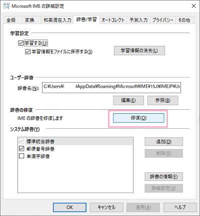 ユーザー辞書を修復してみる