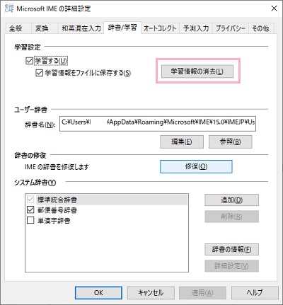 「Microsoft IMEの詳細設定」の「辞書/学習」タブをクリックして開き、「学習設定」項目の「学習情報の削除」ボタンをクリックしましょう。