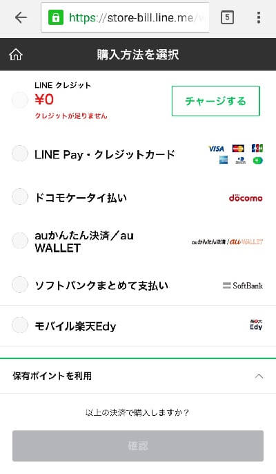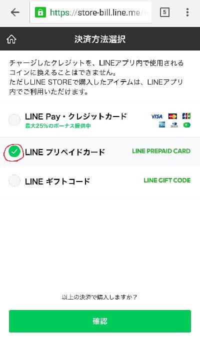 決済方法を選択する画面が表示されるので「LINE プリペイドカード」を選択しましょう。 選択したら画面下の「確認」をタップ
