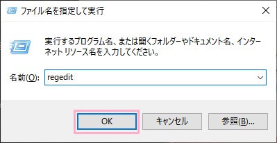 それでは、Windows10で特定のドライブを非表示にする方法を説明します。まずは「Windowsキー+Rキー」の同時押しで「ファイル名を指定して実行」を呼び出し、「regedit」と入力して「OK」をクリックしましょう。
