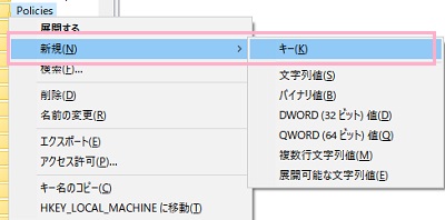 「Policies」を右クリックしてメニューの「新規」→「キー」をクリックして作成されるキーの名前を「Explorer」にしましょう。