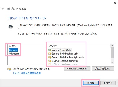 もし一覧に使用しているプリンターのドライバーがない場合は「Windows Update」をクリックしてアップデートを行うことでドライバーが追加される可能性があります。プリンターにドライバー用CDなどのメディアが付属している場合はディスクドライブにCDを入れてから「ディスク使用」をクリックしましょう。